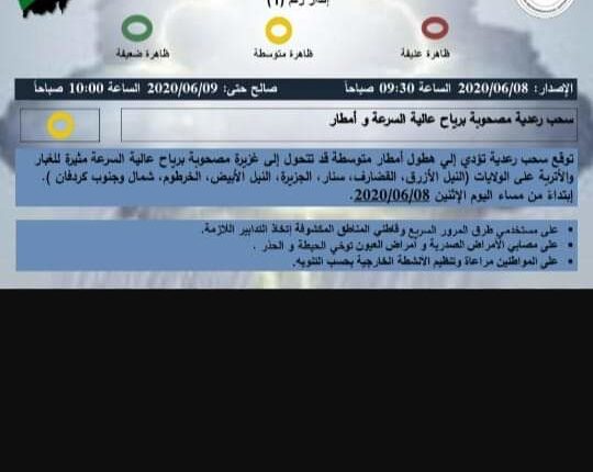 توقعت الهيئة العامة للإرصاد الجوية – وحدة الإنذار المبكر ظهور سحب رعدية تؤدي إلى هطول أمطار متوسطة قد تتحول إلى غزيرة مصحوبة برياح عالية السرعة مثيرة للغبار والأتربة على ولايات (النيل الأزرق والأبيض ، القضارف ، سنار ، الجزيرة ، الخرطوم ، شمال وجنوب كردفان ) إبتداء من مساء اليوم “الإثنين” .